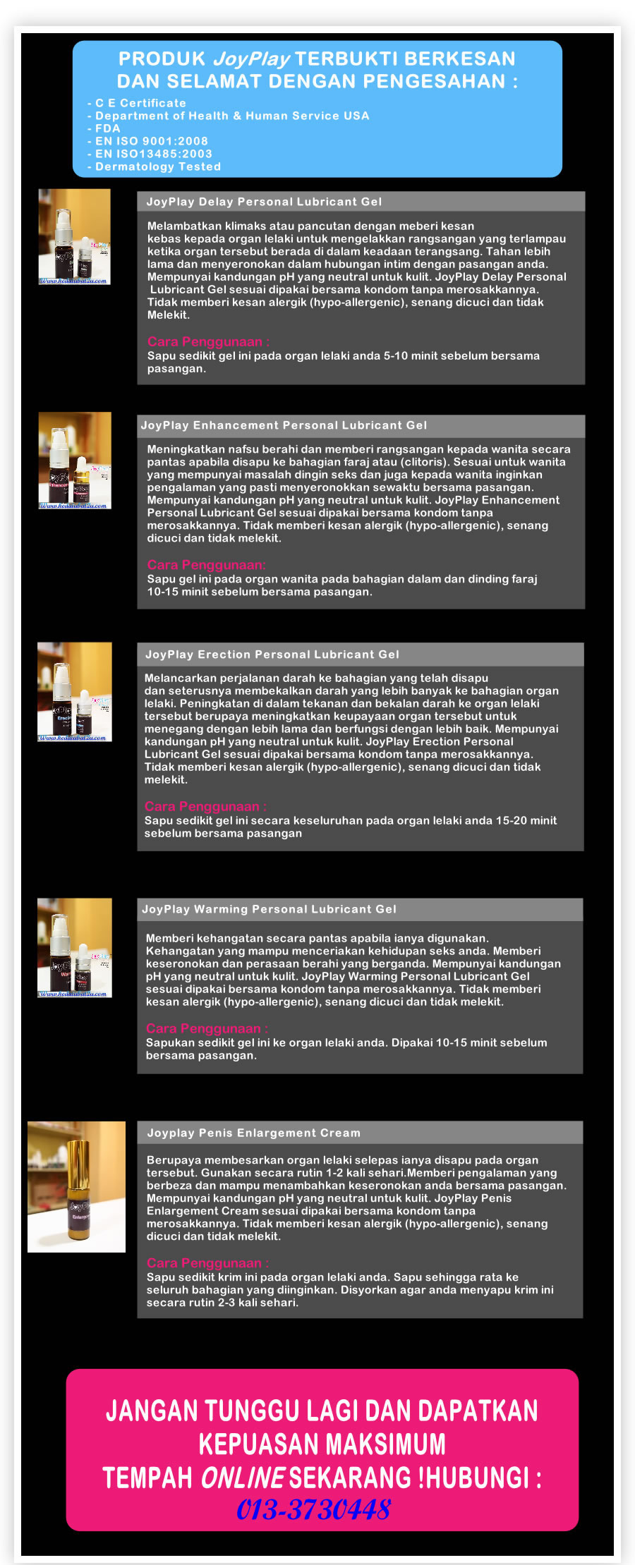 Produk JoyPlay telah diuji sepenuhnya di makmal sebelum dipasarkan bagi mengelak kesan sampingan kepada pengguna.